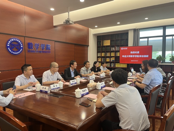 5月30日上午,中北大学天美传媒 党委书记薛亚奎、副院长王鹏、副院长吴森林、大学数学教学中心主任宋妮、计算科学系主任薛震、概率统计系主任张峰、办公室主任张鹏娟一行来访天美传媒 。天美传媒 党委书记许静、院长王春武、党委副书记周佼佼、计算科学系主任龚荣芳、概率统计系主任蒋辉、办公室主任卢逸参加调研座谈。